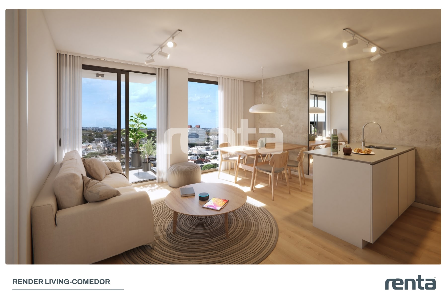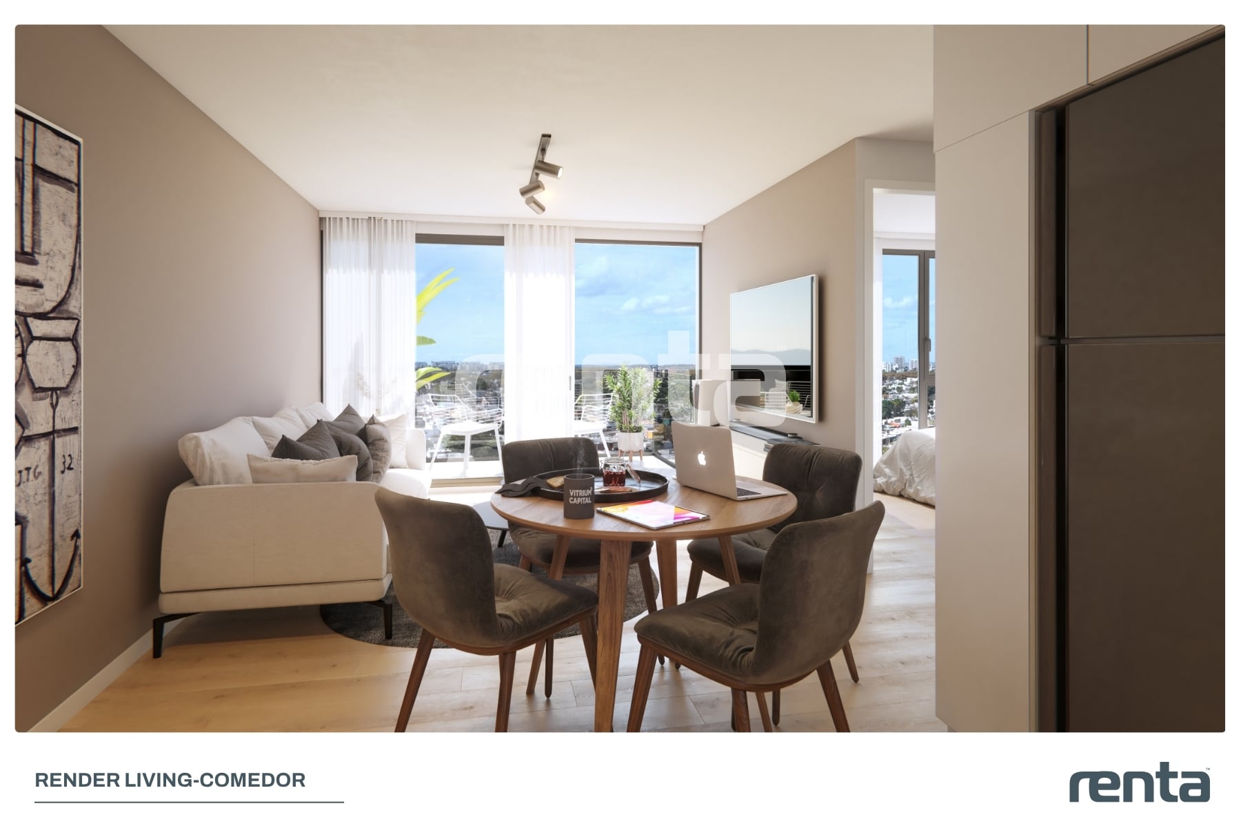 Unidad seleccionada para renta, la más amplia de la torre, gran living-comedor, lugar para home office y vista panoramica al centro financiero y Río de la Plata.
